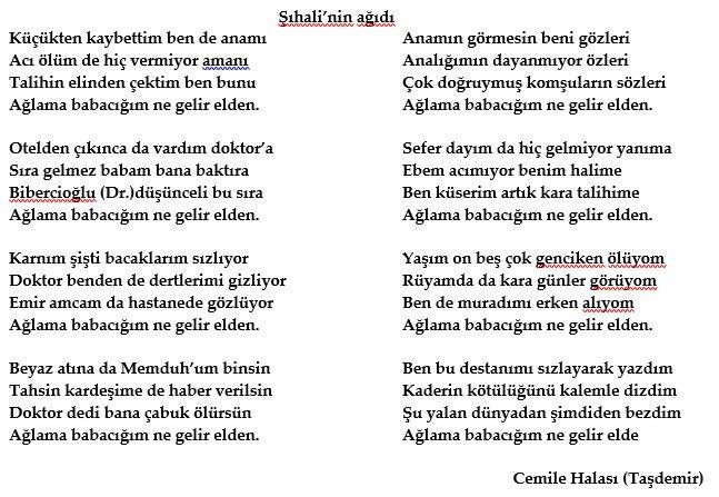 Annesi öldükten sonra öksüz kalan, ilgisizlik ve bakımsızlıktan pejmürde dolaşan, Habibe hala’sının himayesi ile büyüyen Şıhali genç yaşta Siroz hastalığına yakalanır. Gün be gün eriyen ve de doktorların derdine çare bulamadıkları Hacı oğlu Şıhali Sarıdemir (1945-1959) 14 yaşında hayata veda etmiş. Halası oğlu Ethem Şimşek tarafından Şıhali için şu ağıt yakılmıştır.